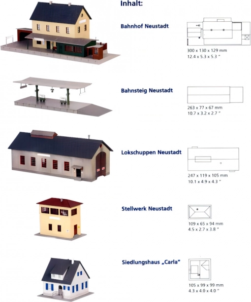 Komplet građevina za modelarske makete omogućuje vam brzo postavljanje autentične scene kolodvora Neustadt i njegove okoline. Razrađena koloristika i precizno uklopljeni plastični dijelovi jamče izvrstan izgled i laku montažu. U pakiranju je detaljan priručnik, pa se možete usredotočiti na oblikovanje krajolika i pozicioniranje pojedinih elemenata.