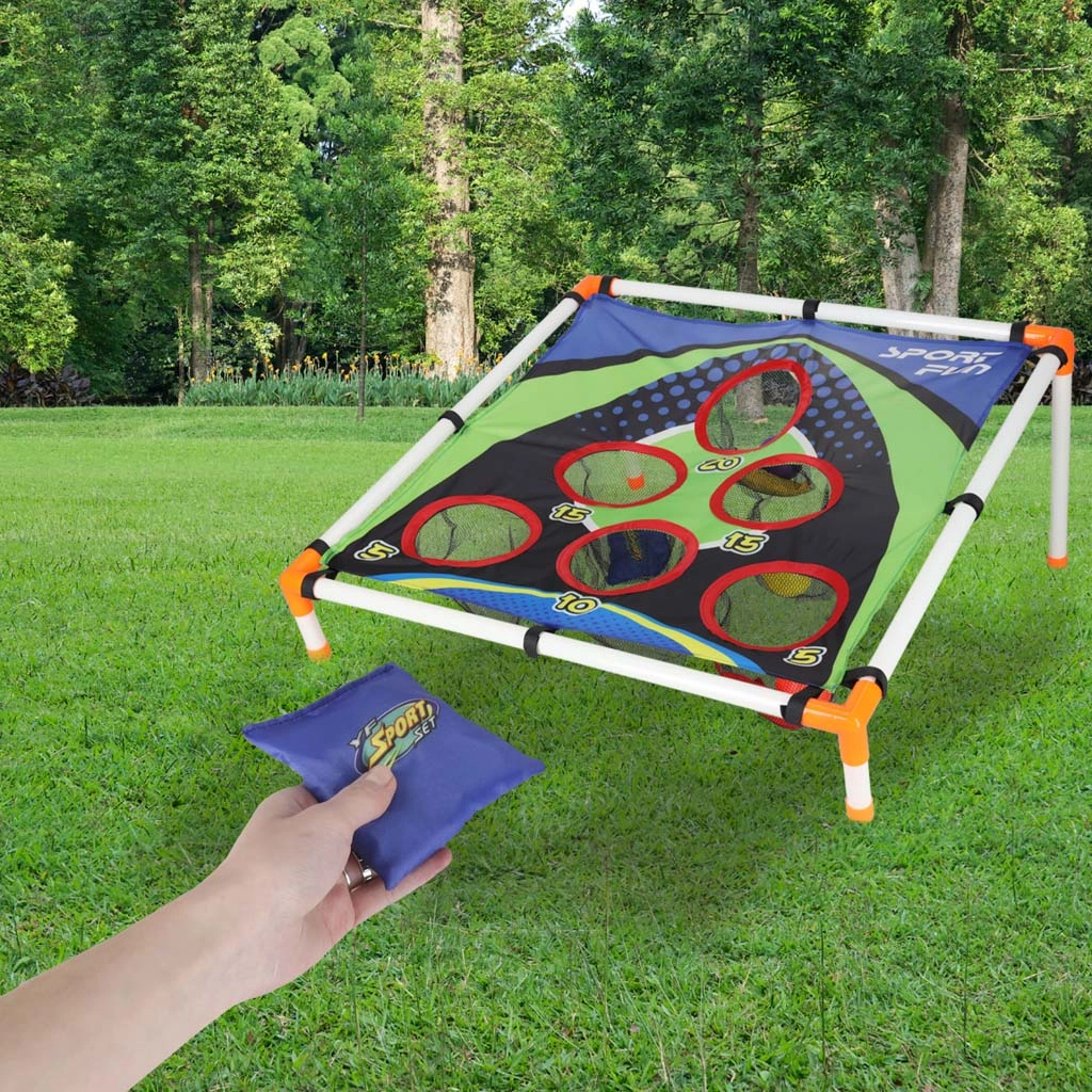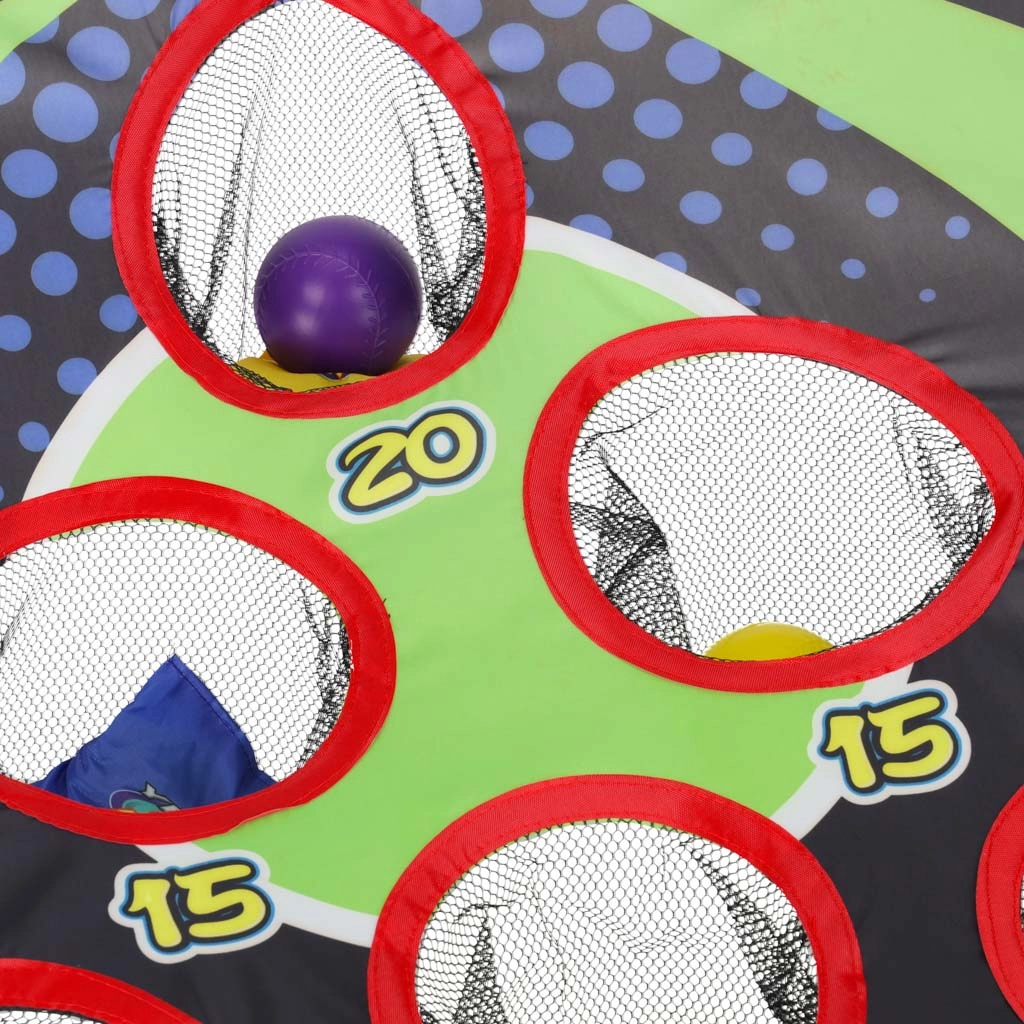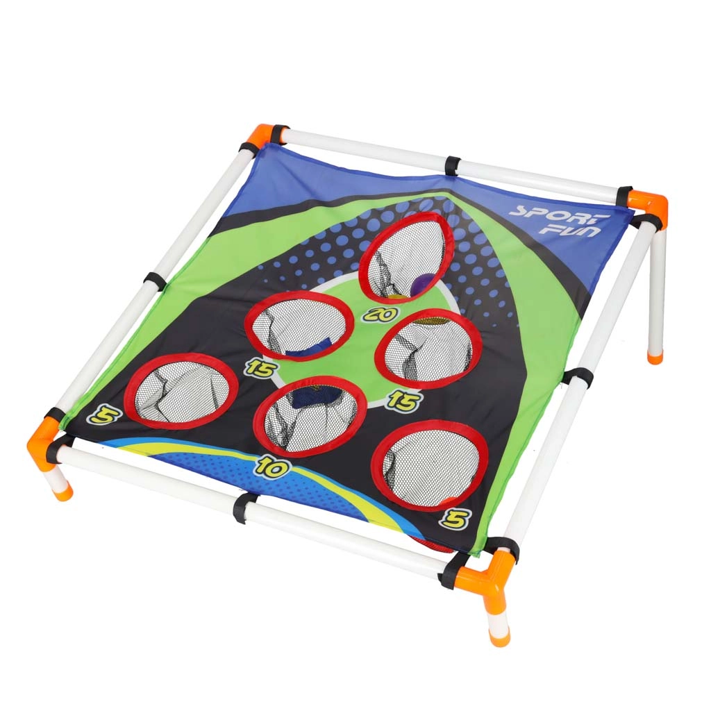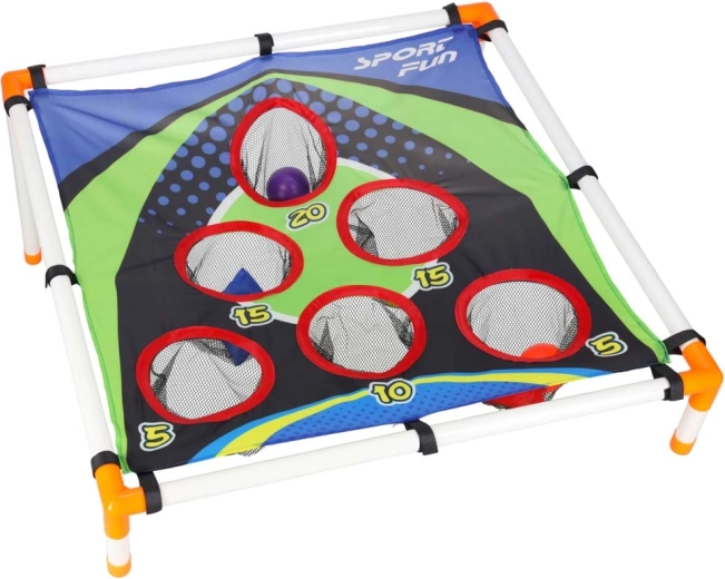 Zabavna igra bacanja za djecu koja razvija koordinaciju oko–ruka, preciznost i brze reakcije. Lagani okvir s nakošenom metom i označenim otvorima nudi različite bodovne izazove. Prikladno za vrt i interijer, jednostavno sastavljanje i lako prenošenje. U kompletu su vrećice za bacanje i plastične loptice.