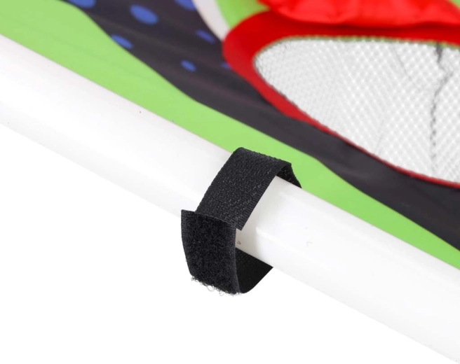 Lagana konstrukcija od plastičnih cijevi s nakošenim stalkom osigurava stabilnost, čvrsta tekstilna površina s pet do šest bodovanih otvora hvata vrećice i loptice u mrežice. Sastavljanje je intuitivno, a cijelo igralište lako ćete ponijeti bilo kamo.