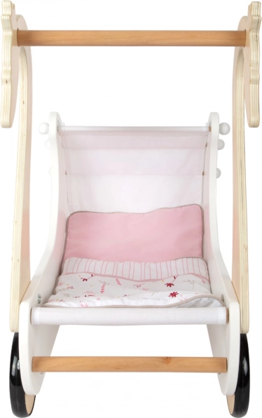 Ukrašena nježnim bojama i jednostavnim oblicima, ova kolica za lutke uveseljavat će njihove svakodnevne igre. Zahvaljujući svojoj robusnoj konstrukciji, može primiti lutke do visine 46 cm. Kolica su opremljena sklapanjem tkanine i uključuju dvodijelnu cvjetnu ružičasto-bijelu posteljinu. Gumirana kolica osiguravaju tiho i glatko kretanje na svakoj podlozi, dok pažljivo izrađena konstrukcija od izdržljive šperploče i masivnog drveta nudi dugotrajnu podršku.
