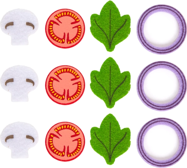 Set sadrži 12 filcanih imitacija sastojaka poput gljiva, rajčica i luka, koji djeci nude mogućnost pripreme raznolikih jela.
