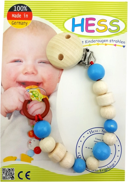 Praktični klips za dudu u nježnoj svijetloplavoj boji drži dudu uvijek pri ruci i čistom. Ima metalni klips za sigurno pričvršćivanje na odjeću i univerzalni silikonski prsten za pričvršćivanje većine duda. Proizvedeno u Njemačkoj od kvalitetnog drva s neškodljivim bojama, otpornim na slinu i znoj.
