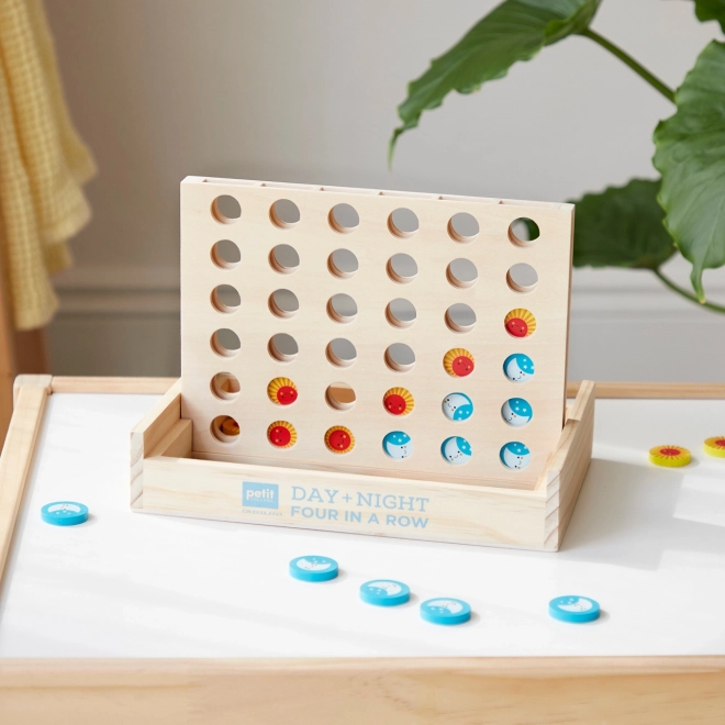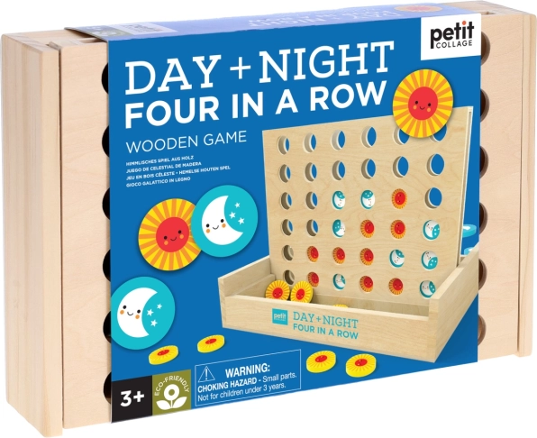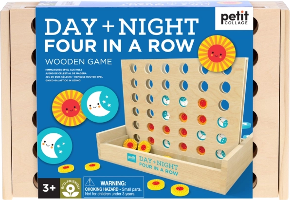 Drvena igra četiri u nizu dan i noć zahtijeva od igrača ne samo brzo razmišljanje, već i sposobnost strateškog planiranja. Cilj je postaviti četiri žetona zaredom na mrežu. Žetoni imaju atraktivan sunce i mjesec dizajn koji privlači i veseli male i velike igrače.