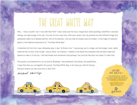 Vrhunsko puzzle Galison Svjetla na Broadwayu, 2000 dijelova. Ilustracija Michael Storrings, precizno uklapajući dijelovi, mat poklon-kutija. Dimenzija 98 × 74,9 cm.