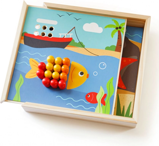 Otkrijte zabavnu mozaičku s motivima plaže koja razvija dječju maštu i vještine. Sadrži 4 slike i 96 čepića u 8 boja koje djeca slažu na poklopac praktične kutije. Igra potiče prepoznavanje boja, finu motoriku, koncentraciju i logičko razmišljanje. Izrađeno od kvalitetnog, odgovorno dobivenog drva – ugodno na dodir i idealno za putovanja.
