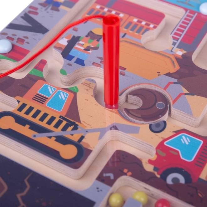 Ovaj kvalitetni drveni magnetički labirint s motivom gradilišta razveselit će djecu od 3 godine naviše. Uz priloženi magnetični pokazivač djeca pomiču šarene kuglice između bagera, kamiona i prepreka, vježbaju logiku i prostornu percepciju te se pritom odlično zabavljaju.