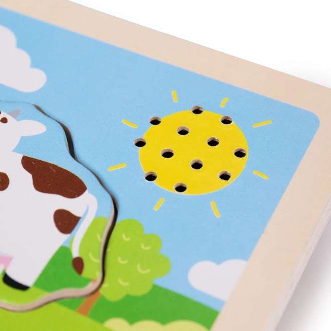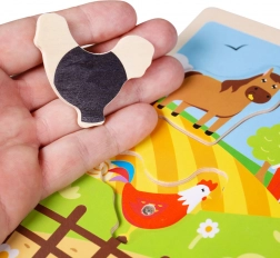 Drvena slagalica s umetanjima sa zvukovima Farma osmišljena je tako da ne samo zabavlja, već i educira. Drveni dijelovi prilagođene su veličine i oblika za male dječje ruke, ugodni su na dodir i pomažu stimulirati osjet dodira. Žive boje i preslatka lica životinja lako privlače dječju pozornost. Proizvod je izrađen od kvalitetnog drva, dobivenog odgovorno i obrađenog neškodljivim bojama.