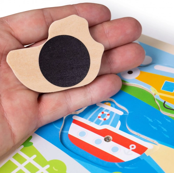 Zabavna drvena slagalica s umetanjem za djecu s motivom prijevoznih sredstava, koja nakon stavljanja dijela na pravo mjesto reproducira zvuk karakterističan za dani stroj te tako razvija dječje kognitivne vještine.