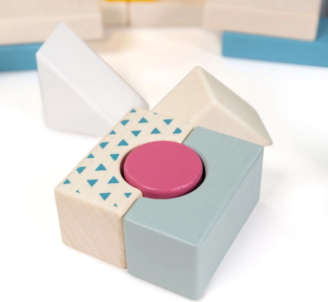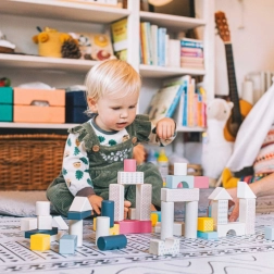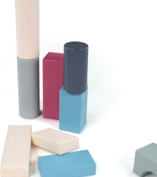 Ovaj bezvremenski drveni set za građenje nudi djeci beskrajne mogućnosti – od jednostavnih tornjeva do malih arhitektonskih dragulja. Kocke su dizajnirane tako da savršeno pristaju u male ručice, a zahvaljujući zaobljenim rubovima i glatkoj površini njima se rukuje lako i sigurno. Raznoliki oblici i boje potiču kreativnost, prostornu predodžbu i prve logičke veze.