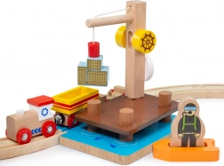 Ovaj lučki set daje vašoj željezničkoj pruzi realističnu atmosferu. Funkcionalna dizalica s magnetom sigurno prenosi teret između doka, vagona i čamca, dok je figurica ronioca spremna za svaku spasilačku akciju. Robusna drvena izrada osigurava dug vijek trajanja i sigurnu igru.