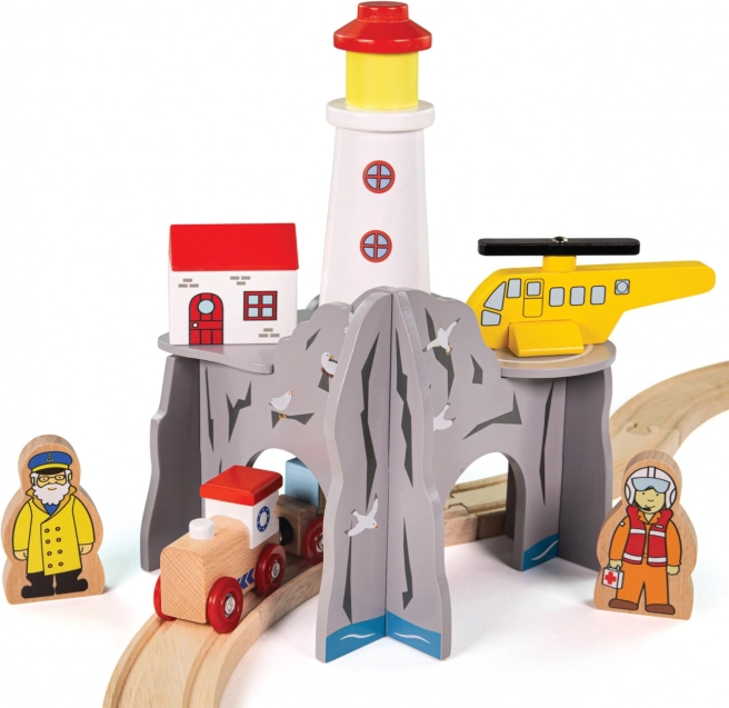 Obogatite dječju drvenu željezničku prugu obalnom scenografijom sa svjetionikom i heliportom. Ovaj drveni set nudi četverosmjerni tunel, svjetionik, helikopter i 2 figurice za beskrajne priče i spasilačke misije. Ističe se robustnom izradom, kompatibilan je s većinom drvenih željezničkih pruga i proizveden je od odgovorno dobivenog drva s nezapaljivim i netoksičnim bojama.