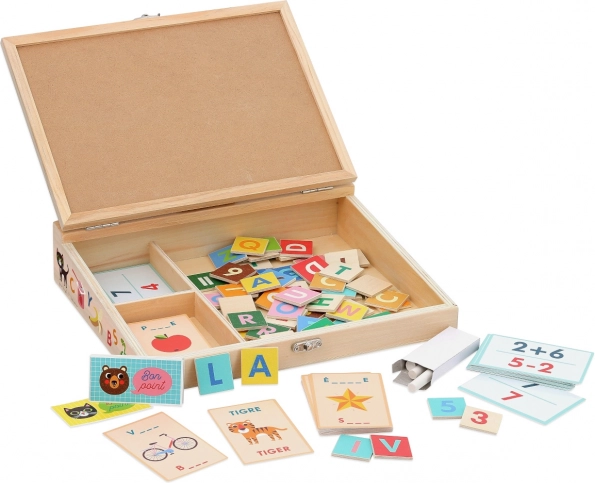 Vratite se u nostalgiju školskih dana s čarobnom pločom brenda Vilac, ilustriranom umjetnicom Ingelom P. Arrhenius. Ova čvrsta drvena ploča u kućištu nudi bogatu opremu za učenje pisanja, računanja i osnove engleskog i francuskog. Zahvaljujući 70 drvenih pločica sa slovima i brojkama, 80 kartica rječnika, 30 kartica zadataka i 12 bodovnih kartica, djeca uče kroz igru. U kompletu su 2 krede, pa se ploča može odmah početi koristiti.