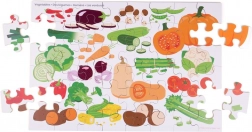 Slagalica uključuje različite vrste povrća, kao što su bundeve, paprike i mrkve, uči djecu o prehrani i zdravom životnom stilu.
