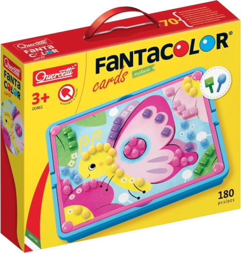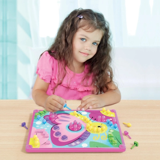 Krpasta mozaička igra s košarom za pohranu i 4 unaprijed otisnute slikovne kartice za umetanje klinčića. Mozaička igra koja razvija finu motoriku, koordinaciju ruka-oko i kreativno razmišljanje. Sastoji se od 4 unaprijed otisnute, perforirane kartice, 180 šarenih klinčića, podloge za umetanje, pričvrsnog okvira i košarice za pohranu. Preporučeno za djecu od 3 godine. Sadržaj pakiranja: 1 košarica za pohranu, 1 podloga s otvorima za klinčiće, 1 pričvrsni okvir, 4 perforirane kartice sa slikama, 180 šarenih klinčića u 2 oblika i 6 boja. Glavne značajke: potiče finu motoriku, koordinaciju ruka-oko, kreativno razmišljanje