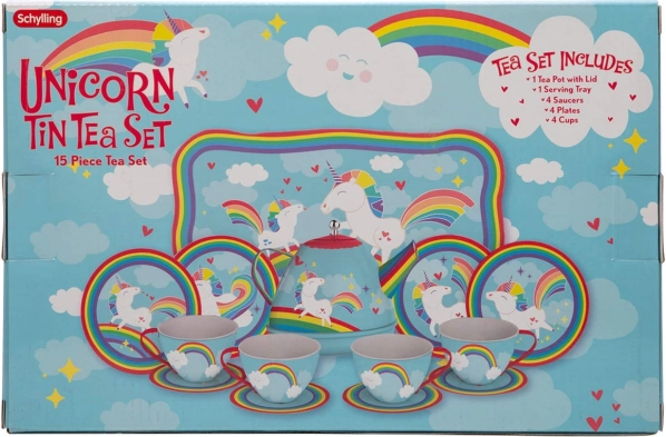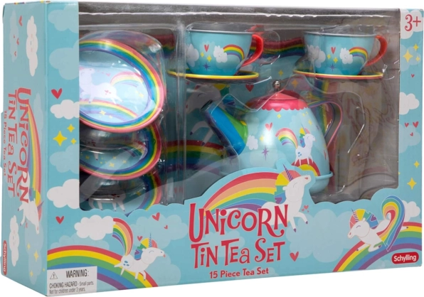 Presladak set za čaj s motivom jednoroga razveselit će male domaćice i domaćine. Sadrži 15 dijelova od izdržljivog metala – šalice, tanjuriće, tanjure, čajnik s poklopcem i poslužavnik 24 × 16 cm. Idealan za zamišljene čajanke te razvoj kreativnosti i socijalnih vještina. Prikladno za djecu od 3 godine.
