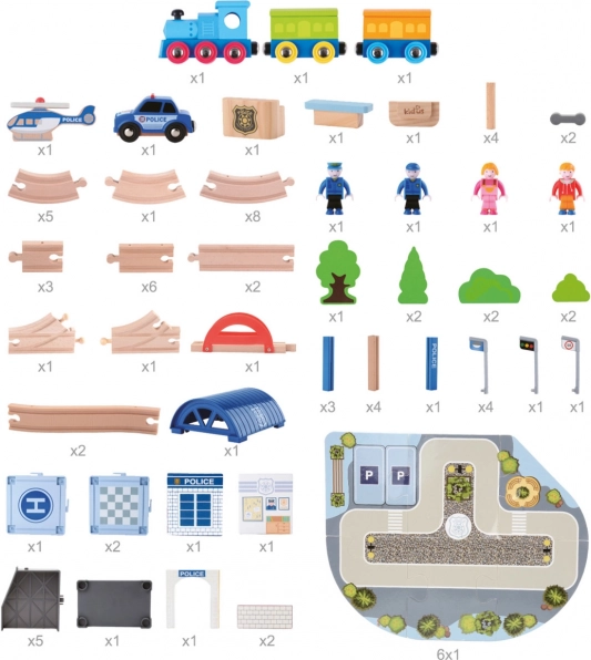 Ova detaljno izrađena drvena željeznička pruga idealna je za male inženjere koji vole vlakove i policijske avanture. Sadrži prugu s mostom, atraktivnu policijsku postaju i druge dodatke, uključujući autić i helikopter.