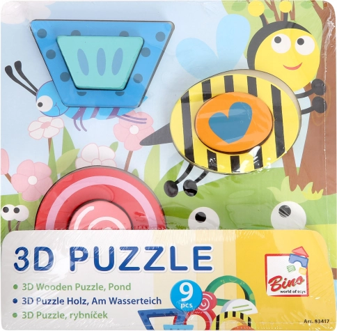 Drvene 3D puzzle ribnjak Bino za djecu od 3 godine. Razvijaju motoriku, prepoznavanje oblika i logiku. Izdržljiva izrada, neškodljive boje. 9 dijelova, dimenzije 18×18×2 cm.