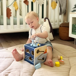 Kocka ne samo da educira, već se i uklapa u svaku shemu boja sobe zahvaljujući kontrastnim bojama i prirodnom drvu. Odvojivi poklopac štedi prostor.