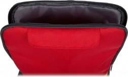 Ruksak u crveno‑žutoj izvedbi ima dvostruki patentni zatvarač za brzo otvaranje, podesive naramenice za udobno nošenje i dvije kopče za pričvršćivanje opreme. Drveni i plastični dijelovi ugodni su za držanje i podnose intenzivnu igru.