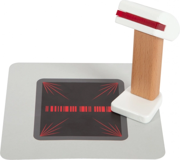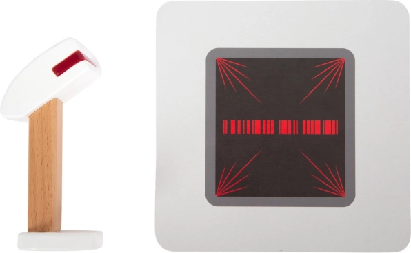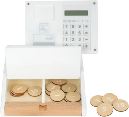 Dio seta su kartice proizvoda, čitač crtičnih kodova, rola računa, skener i 15 obostranih drvenih novčića. Kombinacija drva i plastike jamči izdržljivost te ugodan nordijski dizajn s vidljivom strukturom drva. Blagajna potiče učenje računanja, razvoj mašte i socijalnu interakciju kroz igru trgovine.