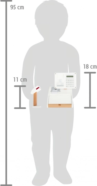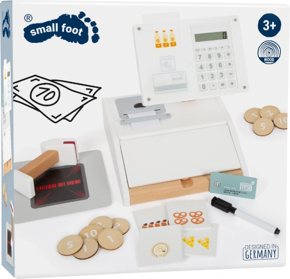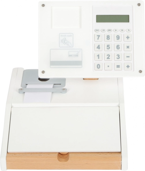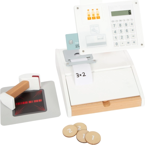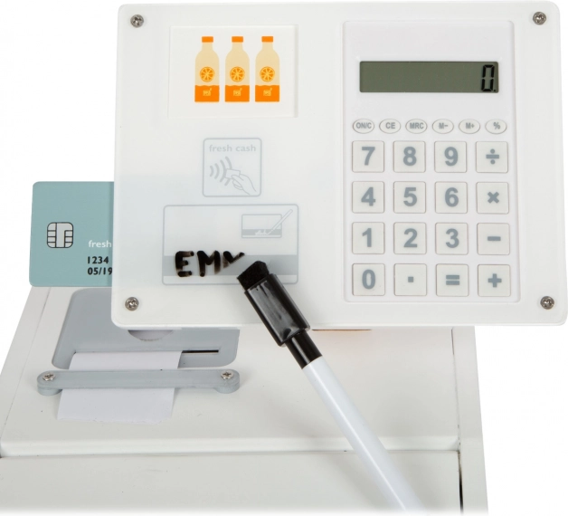 Drvena registra blagajna SMALL FOOT Fresh pretvara svaki dječji kutak u mali supermarket. Zahvaljujući integriranom kalkulatoru u okretljivom monitoru djeca lako izračunaju kupnju, otvaraju veliku ladicu s pretincima za novčiće i isprobavaju bezgotovinsko plaćanje vlastitom karticom i potpisom na pleksiglasu.