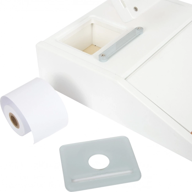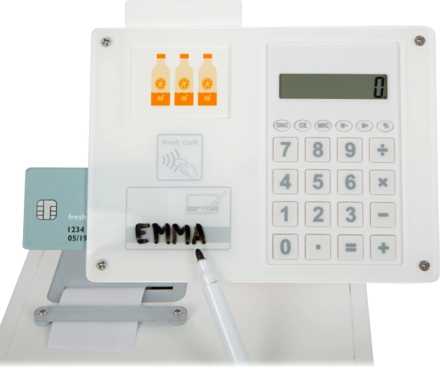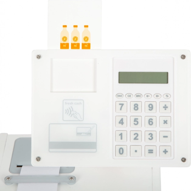 Integrirani kalkulator u okretljivom monitoru, rola potrganih računa i utor za karticu omogućuju djeci doživjeti stvarni tijek kupnje – od skeniranja robe do ispisa računa.