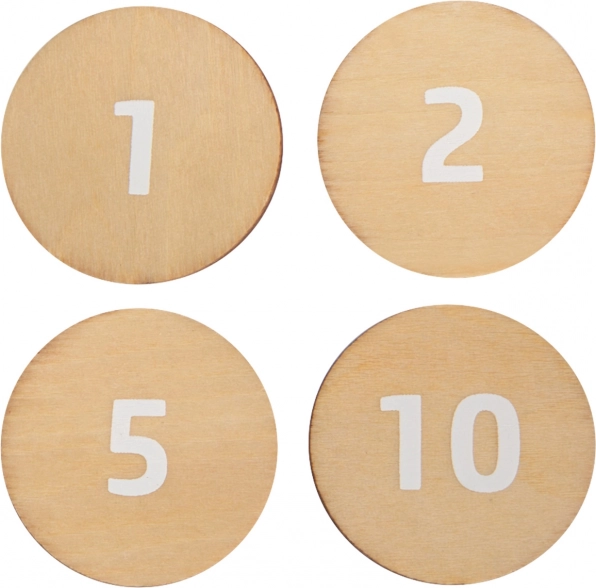 Obostrani drveni novčići i kartice proizvoda pomažu djeci vježbati računanje, prepoznavanje vrijednosti i osnovnu financijsku pismenost kroz igru.
