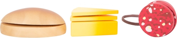 Ovaj kvalitetan set od čvrstog drva donosi sve što mali kuhari trebaju: dasku s mogućnošću pisanja kredom, siguran drveni nož i bogat izbor namirnica – rajčica, krastavac, mrkva, jabuka, banana, sir, salama, maslac i pecivo. Pojedini dijelovi drže se zajedno pomoću čička, pa ih djeca mogu iznova i iznova “rezati” i sastavljati.