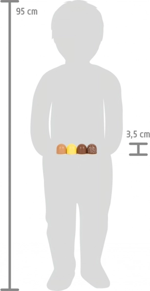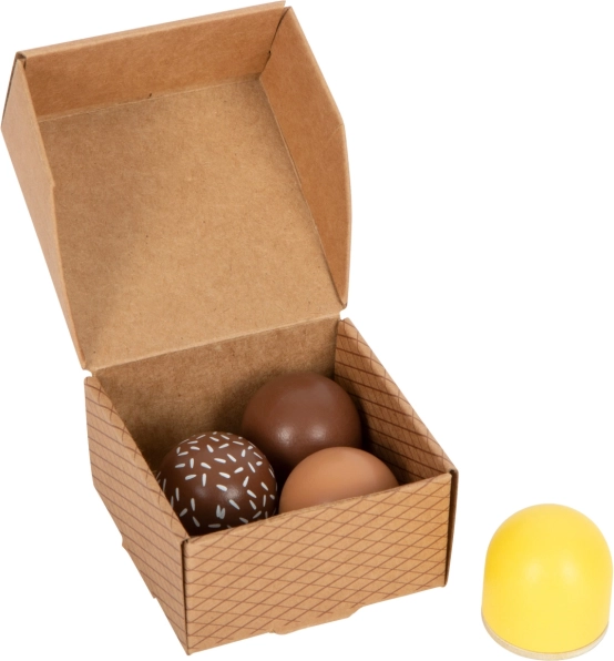 Četiri varijante pralina - bijela čokolada, tamna čokolada, tamna čokolada s posipom i mliječna čokolada - ugodno će osvježiti dječje igre. Njihov prirodni izgled i eko kartonsko pakiranje dizajnirani su kako bi oduševili i inspirirali djecu za maštovitu igru.