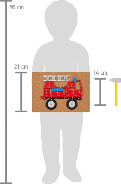 Opsežan kreativni set za igru s tematikom prometa, koji sadrži podlogu od pluta, drveni čekić i mnogo drvenih dijelova različitih oblika i boja. Pomaže razvijati kreativnost, spretnost i koordinaciju ruke i oka.