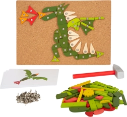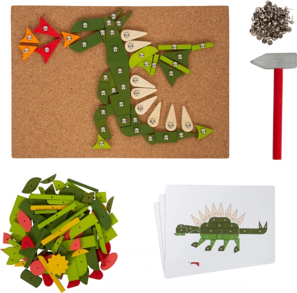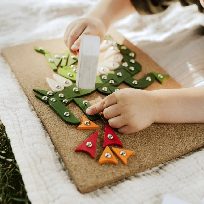 Set uključuje plutenu podlogu, drveni čekić, šarene dijelove i pribadače za stvaranje slika.