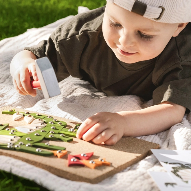 Kreativna igra zabijanja za djecu koja razvija njihovu finu motoriku i kreativnost. Set sadrži plutenu podlogu, drveni čekić i razne šarene drvene dijelove.