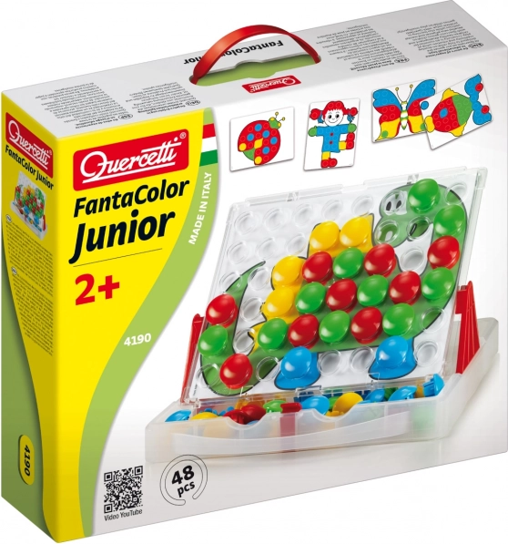 Quercetti Fantacolor Junior – kreativni mozaik u koferu za djecu od 2 godine. 48 čepova, 8 dvostranih predložaka, razvoj motorike i prepoznavanja boja. Proizvedeno u Italiji.