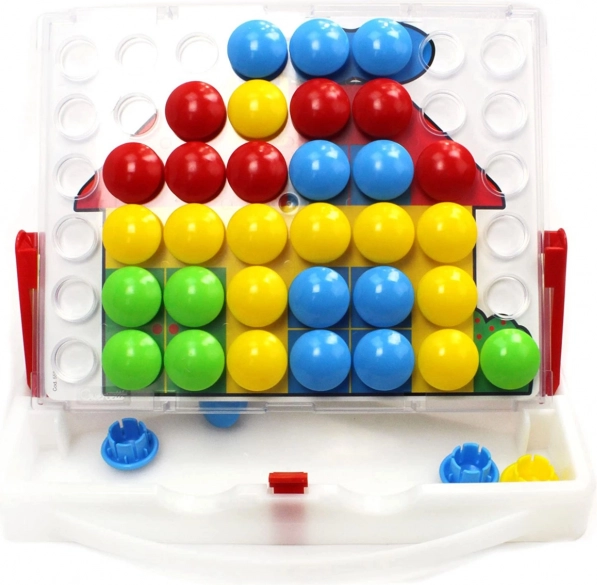 Mozaik u praktičnom koferu omogućuje djeci slaganje veselih sličica prema priloženim šablonama ili vlastitoj mašti. Ploča se može umetnuti u oslonce i koristiti u okomitom položaju za još udobnije igranje. Veliki, šareni čepovi sigurni su i lako se hvataju i za male dječje ruke.