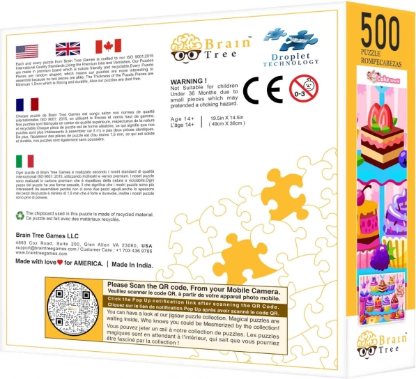 Slagalica U Slastičarnici brenda Brain Tree donosi jedinstveno iskustvo zahvaljujući nasumično rezanim dijelovima koji dodaju dozu pustolovine svakom slaganju. Svaki je dio original, što jamči zabavu pri svakom ponovnom slaganju. Mat završna obrada omogućuje lijep prikaz i pri promjenjivim svjetlosnim uvjetima.