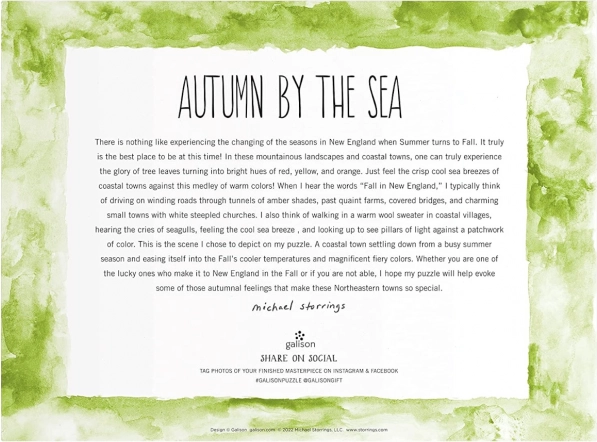 Uživajte u šarenom lišću, svjetioniku i živahnoj luci koje je zabilježio nagrađivani ilustrator Michael Storrings. Motiv je pun detalja koje je zabavno otkrivati pri svakom slaganju.