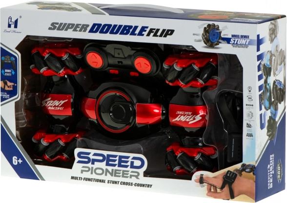 Doživite adrenalin s kaskaderskim RC autom SPEED PIONEER 360 u plavoj boji. Zahvaljujući dva upravljača – klasičnom joysticku i narukvici s gravitacijskim senzorom – upravljat ćete gestama. Auto je obostrano, izvodi 360° okrete, ima 2 načina vožnje (trkaći i off-road), višesmjerna kola i domet do 20 m na frekvenciji 2,4 GHz.