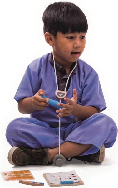 Dječji kostim liječnika od BIGJIGS TOYS pretvara svaku igru u spasilačku misiju. U kompletu su plava majica i hlače s čičak-trakom za lako oblačenje i svlačenje, kao i bogata oprema: drveni stetoskop, liječničke ploče za bilješke, toplomjer, džepni sat, injekcijska štrcaljka i flasteri. Kostim je izrađen od pamuka i poliestera te se može prati u perilici rublja.