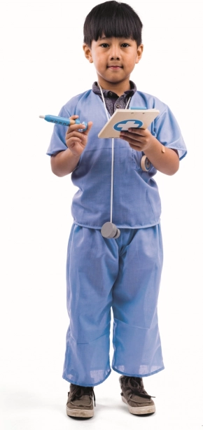 - Majica, hlače, drveni stetoskop, liječničke ploče, toplomjer, džepni sat, injekcijska štrcaljka, flasteri