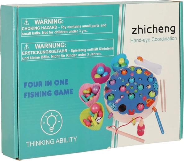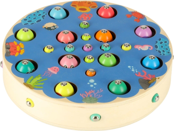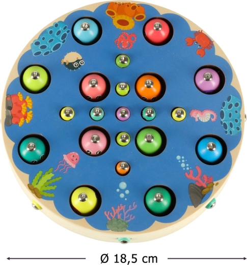 Multifunkcionalni montessori set donosi djeci sate kreativne zabave i učenja. Na okrugloj drvenoj podlozi s oceanskim motivom djeca love magnetne ribice štapovima, izvlače gusjenice, prenose kuglice pomoću pincete ili štapića te uvježbavaju boje, sortiranje i strpljenje. Zahvaljujući bogatoj opremi mogu se igrati i u više djece.