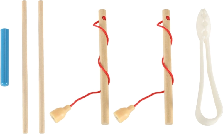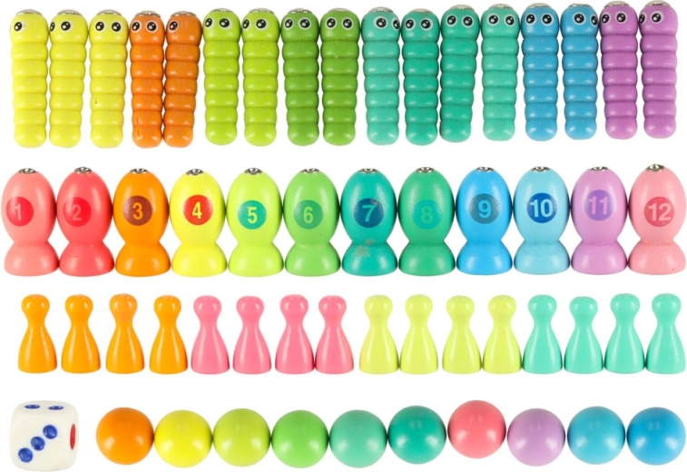 - 1× drvena podloga, 2× štap, 2× štapići, 1× pinceta, 4× silikonska zdjelica, 10× drvena kuglica, 12× ribica, 17× gusjenica, 16× pješak u 4 boje, 1× kocka