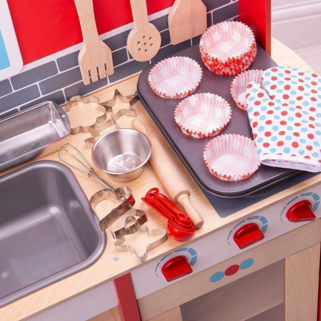 Ovaj sveobuhvatni set za pečenje sadrži svu opremu koju svaki mali kuhar treba za svoje prve pokušaje pečenja. Uključuje lim za pečenje, rukavicu, kalup za kruh, pjenjaču, drveni valjak, zdjelu, set mjernih žlica i šest kalupa za kekse.