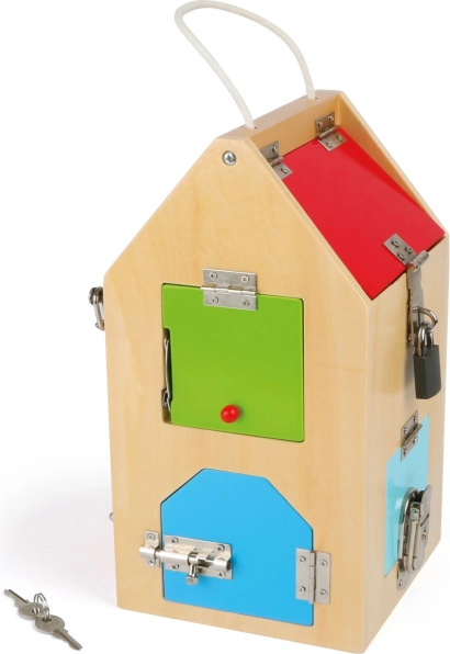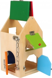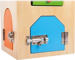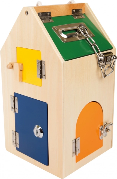 Motorička kućica s bravama small foot pametna je didaktička igračka koja djeci od 3 godine omogućuje sigurno istraživanje svijeta zatvarača i mehaničkih elemenata. Svaka vratašca skrivaju novi izazov – od U-brave i cilindrične brave, preko raznih vijaka i polugica, do pantâ i sigurnosnog lanca. Time se prirodno razvija koordinacija oko–ruka, strpljenje i koncentracija.