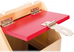 Kućica je izrađena od kvalitetnog drva u kombinaciji s čvrstim metalnim dijelovima, pa podnosi i intenzivno korištenje. Zahvaljujući kompaktnim dimenzijama i praktičnoj ručki lako je prenosiva – idealna za putovanja, vrtić i dječju sobu. Šareni elementi potiču istraživanje i prepoznavanje boja.