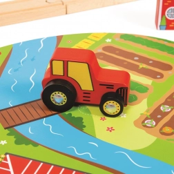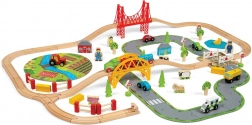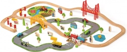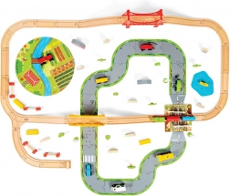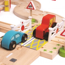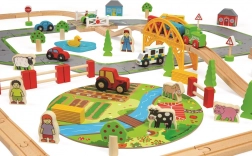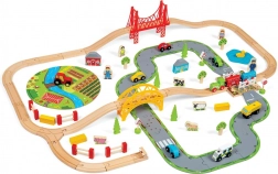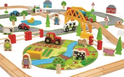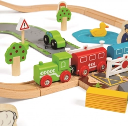 Ova drvena željeznica s ruralnom cestom savršeno je povezana željeznička i automobilska staza koje oponašaju stvarni svijet transporta. Zahvaljujući mostovima i prijelazima vaša će djeca ući u svijet pun zabavnih avantura. Sve je obogaćeno lokalnim dodacima poput farme, zgrada i stabala koja uljepšavaju okolinu.