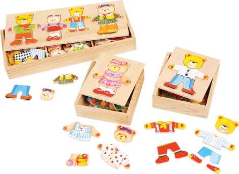 Preslatka drvena oblačilna slagalica za najmlađe pomaže djeci kombinirati odjeću i izraze lica medvjedice. Sadrži 18 dijelova, praktičnu kutijicu s poklopcem–pločom i potiče finu motoriku, koordinaciju oko–ruka te rječnik. Izrađeno od kvalitetnog drva, sigurno od 3 godine i u skladu s europskim sigurnosnim normama.