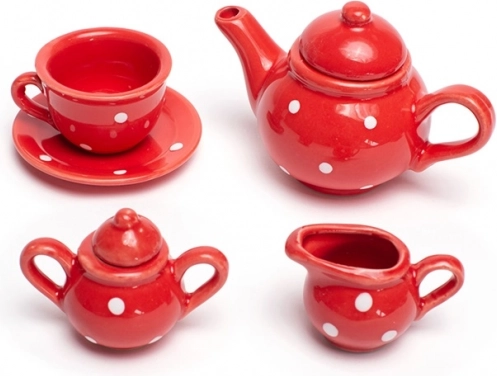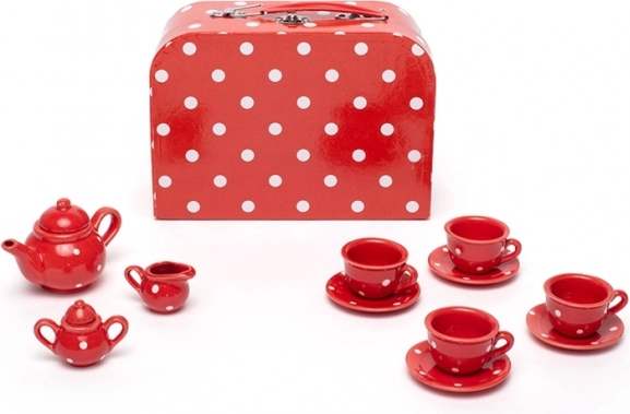 Priredite savršeni dječji čajni party s ovim čarobnim setom u crvenoj boji s bijelim točkama. Set sadrži sve što mali domaćini trebaju – čajnik, 4 šalice s tanjurićima, šećernicu i vrčić za mlijeko. Sve se nakon igre lako pospremi u čvrsti koferčić, pa je set idealan i za putovanja. Proizvedeno od kvalitetnih materijala i u skladu s europskim sigurnosnim normama.
