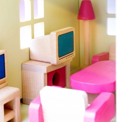Ovaj set drvenog namještaja za kućice za lutke idealno je rješenje za svakog malog dizajnera interijera. Set sadrži sve potrebno za opremanje kuhinje, dnevnog boravka, spavaće sobe, kupaone, pa čak i potkrovlja.