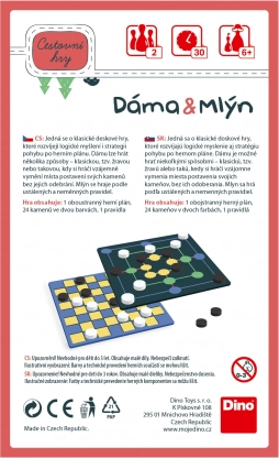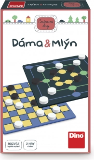 Putna dama i mlin brenda Dino idealan je izbor za obiteljske izlete, godišnje odmore i čekanja na putu. Obostranu ploču lako okrenete – s jedne strane je šahovnica 8 × 8 za damu, s druge klasičan raspored za mlin. Jedan set žetona dovoljan je za obje igre, tako da vam ne treba ništa dodatno.