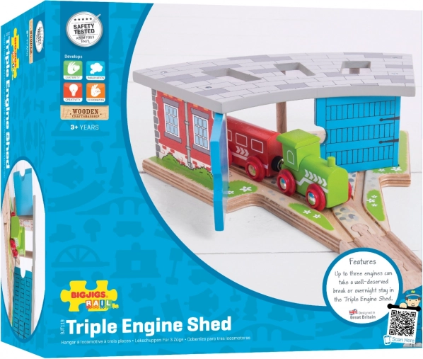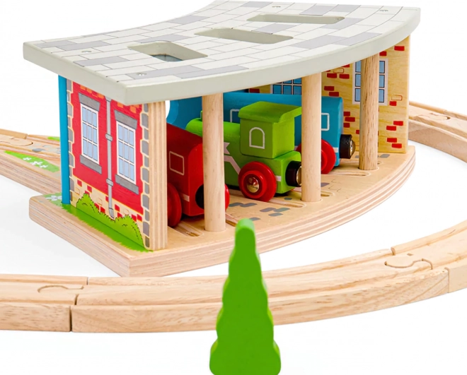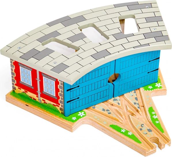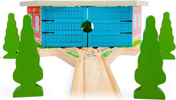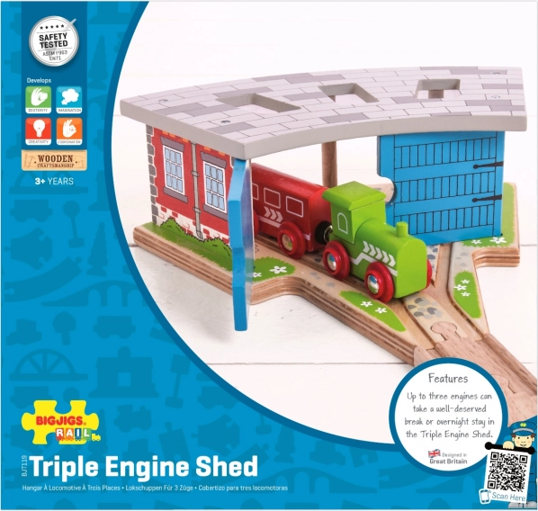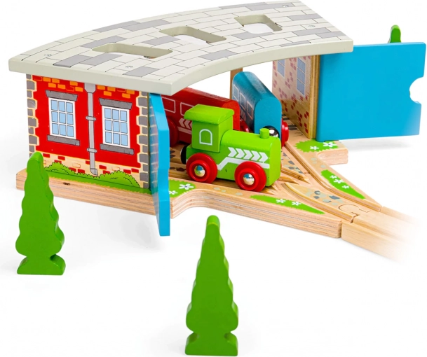 Trostruko spremište s vratima idealan je dodatak za svakog malog strojovođu. Zahvaljujući trima stajalištima i integriranom povezivanju tračnica lako ćete organizirati promet na pruzi i odložiti vlakove nakon dana punog vožnje. Čvrsta drvena konstrukcija s kolorističkim detaljima djeluje realistično i podnosi i intenzivnu igru.